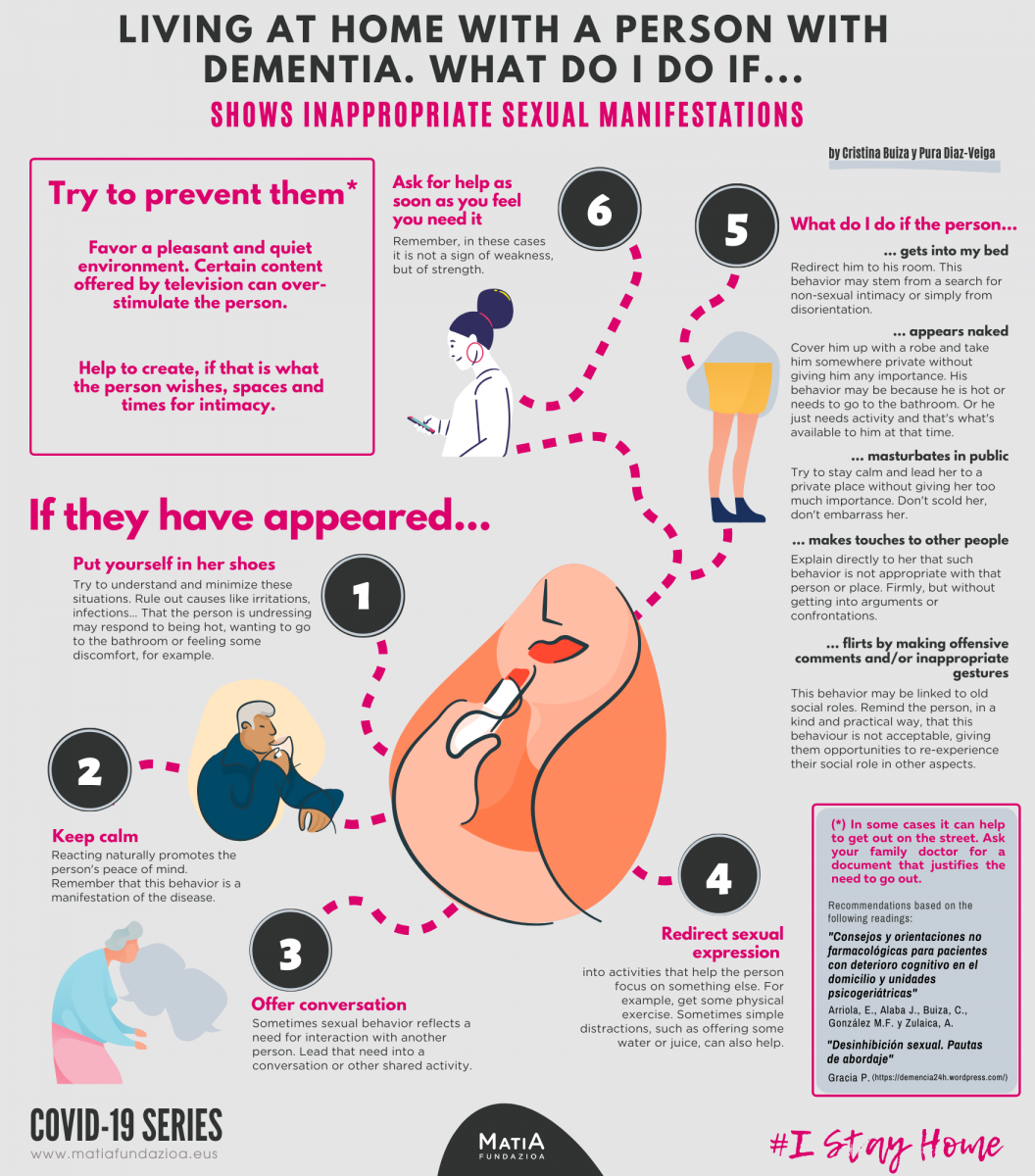 (*) In some cases it can help to get out on the street. Ask your family doctor for a document that justifies the need to go out. Recommendations based on the following readings: "Consejos y orientaciones no farmacológicas para pacientes con deterioro cognitivo en el domicilio y unidades psicogeriátricas". Arriola, E., Alaba J., Buiza, C., González M.F. y Zulaica, A. / "Desinhibición sexual. Pautas de abordaje". Gracia, P.