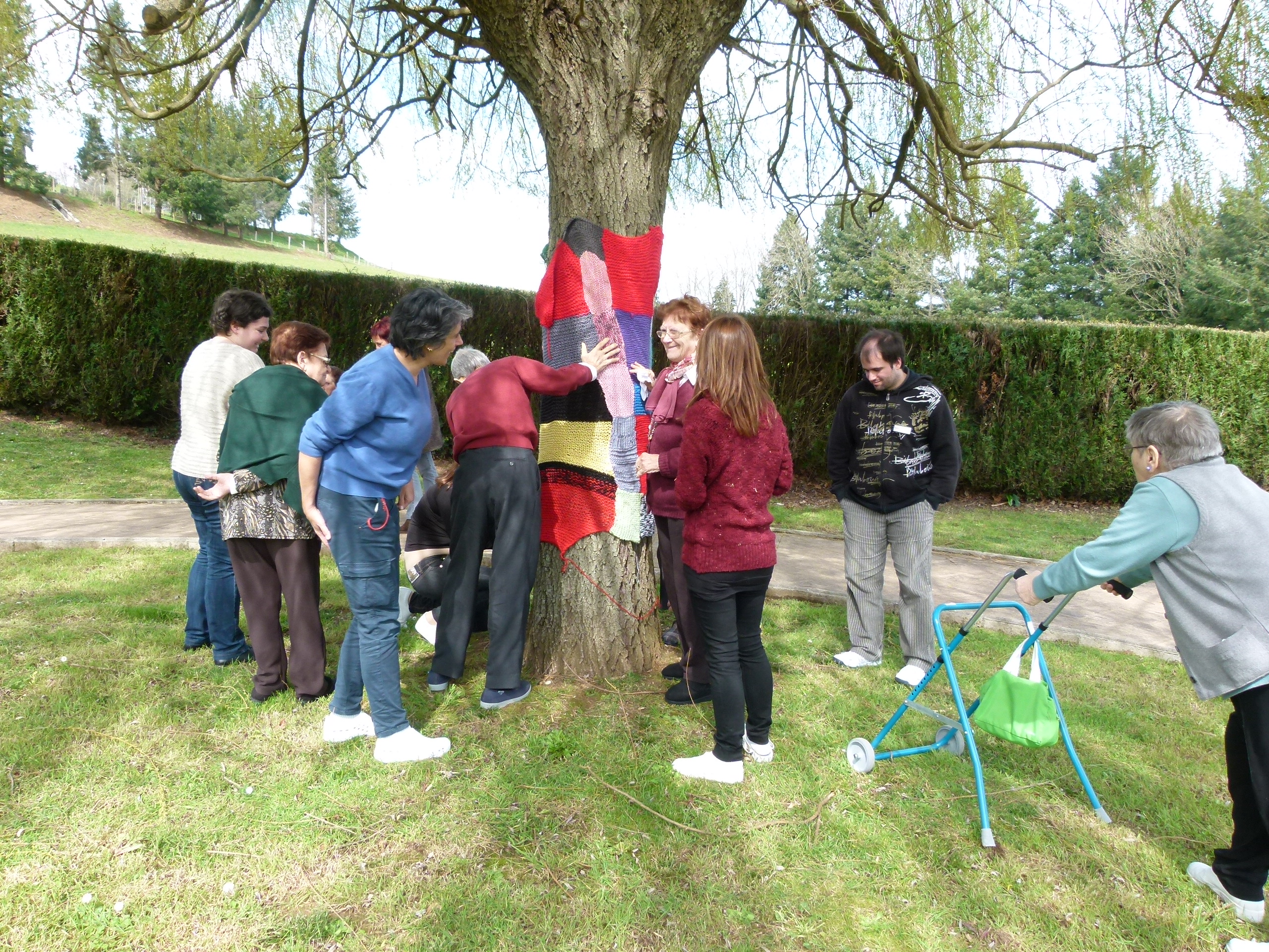 Un día paseando por Donosti, una cuidadora que participa en el proyecto vio los árboles que se encuentran en el Paseo de Vizcaya (Donostiknit) y pensó que porqué no podríamos hacer lo mismo en Fraisoro, ya que árboles no nos faltan y ganas de probar cosas nuevas tampoco.De esta forma, podríamos realizar una actividad entre todo el grupo y disfrutar con todos los pasos que conlleva la realización del proyecto, desde la combinación de colores, pasando por la elaboración de los cuadros de lana, hasta la colocación de ellos en los árboles. Nos lo planteó a todos los que participamos en el proyecto y surgió la primera pregunta por parte de una residente ‘¿una manta para un árbol? ¿para qué?’, la siguiente pregunta fue por parte de un señor ‘yo no sé tejer, pero sé coser porque en la mili estaba en la costura ¿yo que puedo hacer?’ y lo demás fue rodado. Mientras unos escogían los colores, otros ayudaban a soltar las madejas, otros hacían punto y otros cosían.