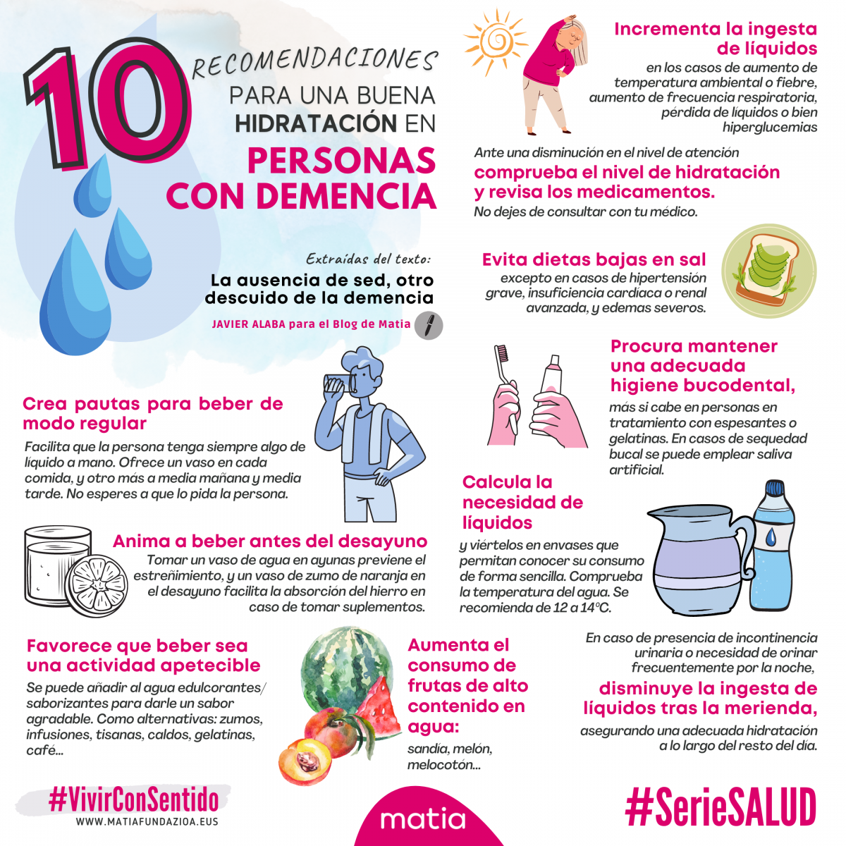 No hay duda de la importancia de una adecuada hidratación en la salud y bienestar de estas personas. Como señala el escritor estadounidense Edward Abbey: “Una gran sed es una gran alegría cuando se apaga a tiempo“. El decálogo que os dejamos a continuación incluye recomendaciones para hacer de este aspecto un aliado en el buen cuidado de quienes conviven con una demencia.