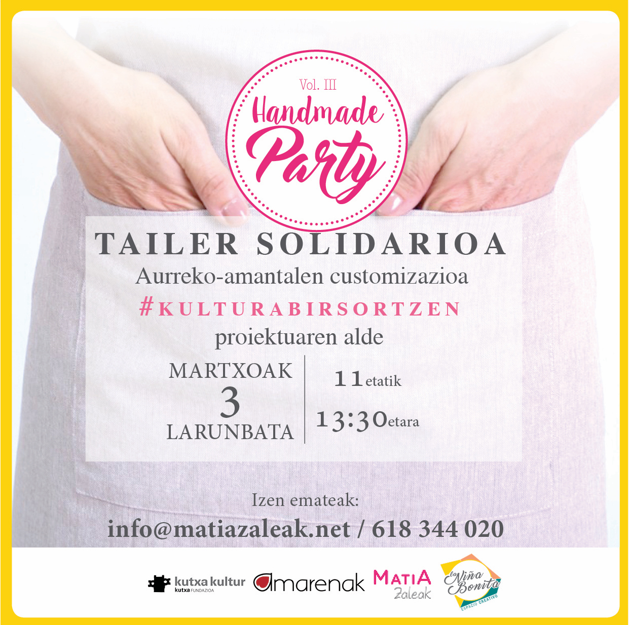 Este sábado 3 de Marzo realizamos en Tabakalera Kutxa Kultur el Hand Made Party, organizado por La Niña Bonita-Espacio Creativo y en colaboración con Amarenak, a favor de MatiaZaleak.