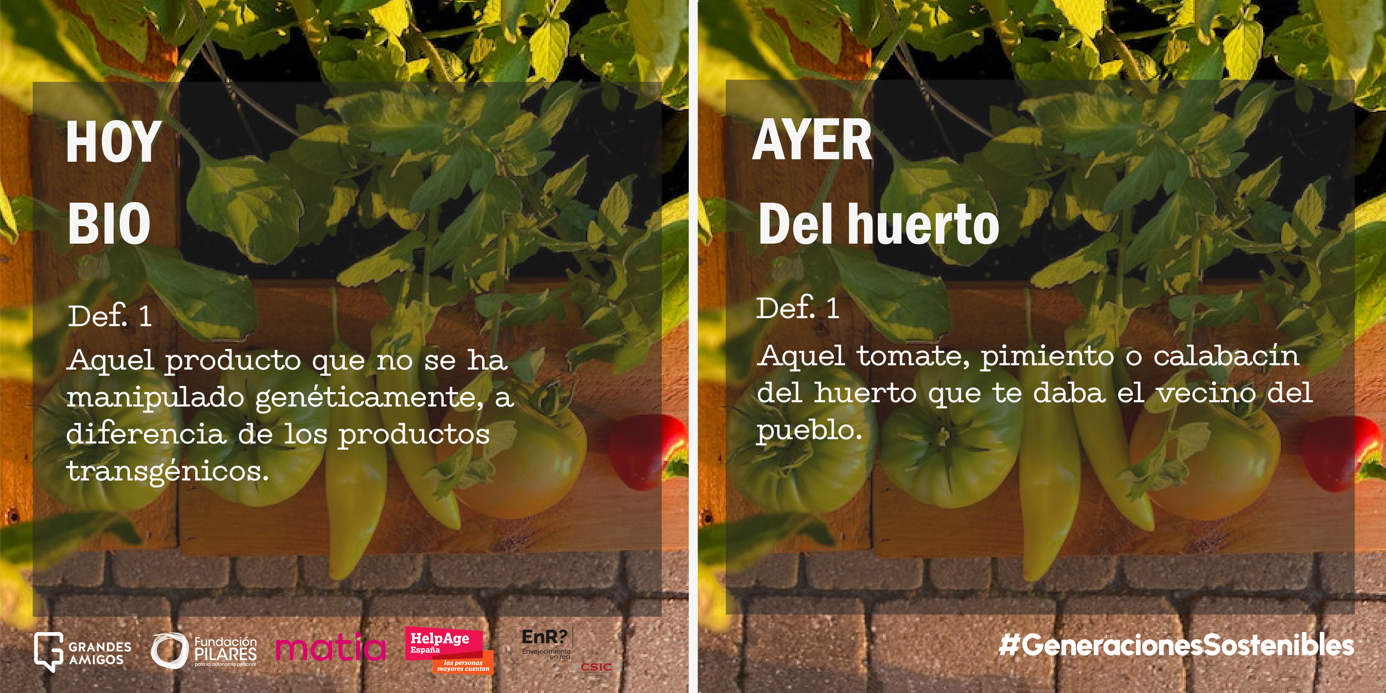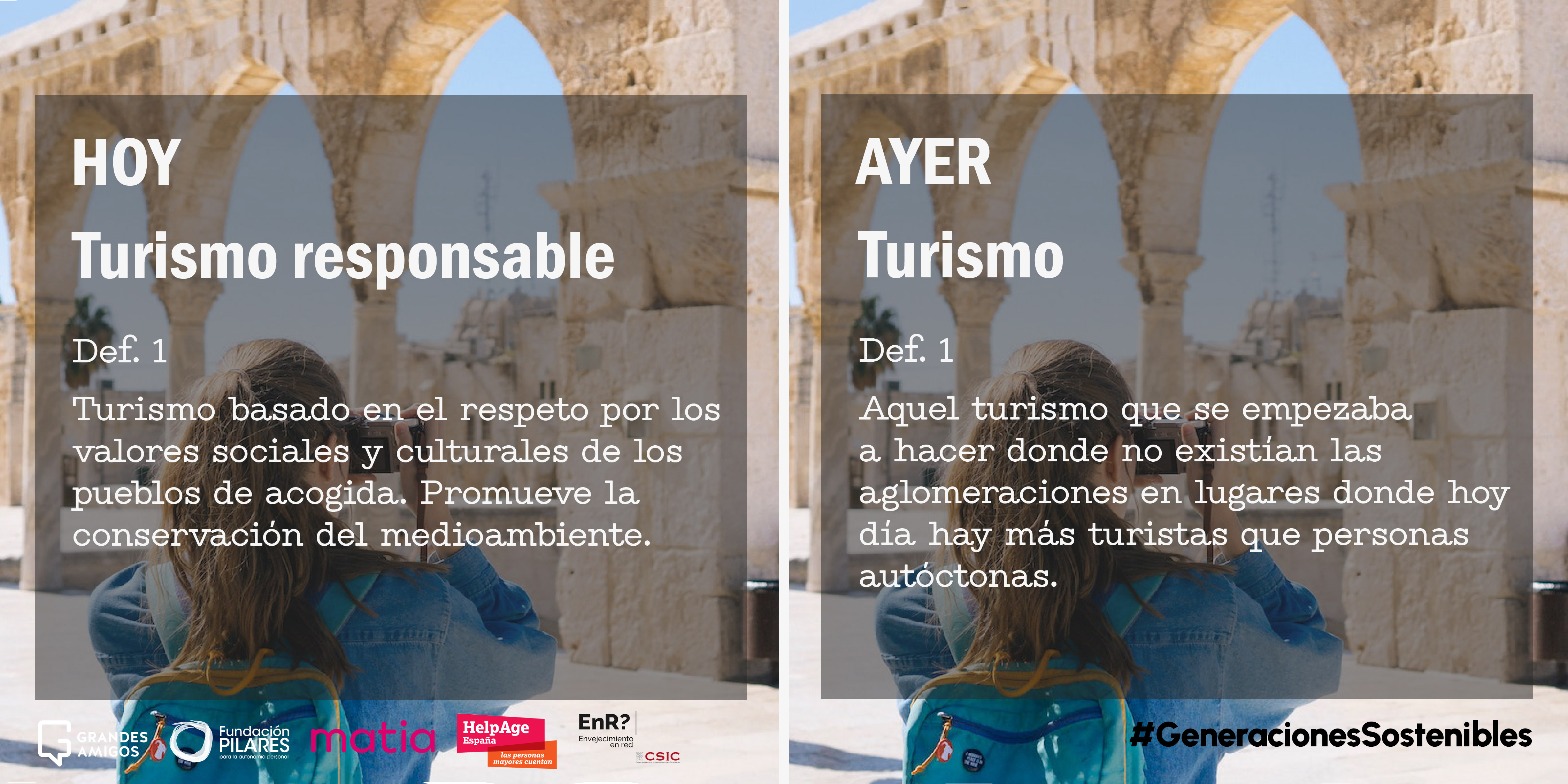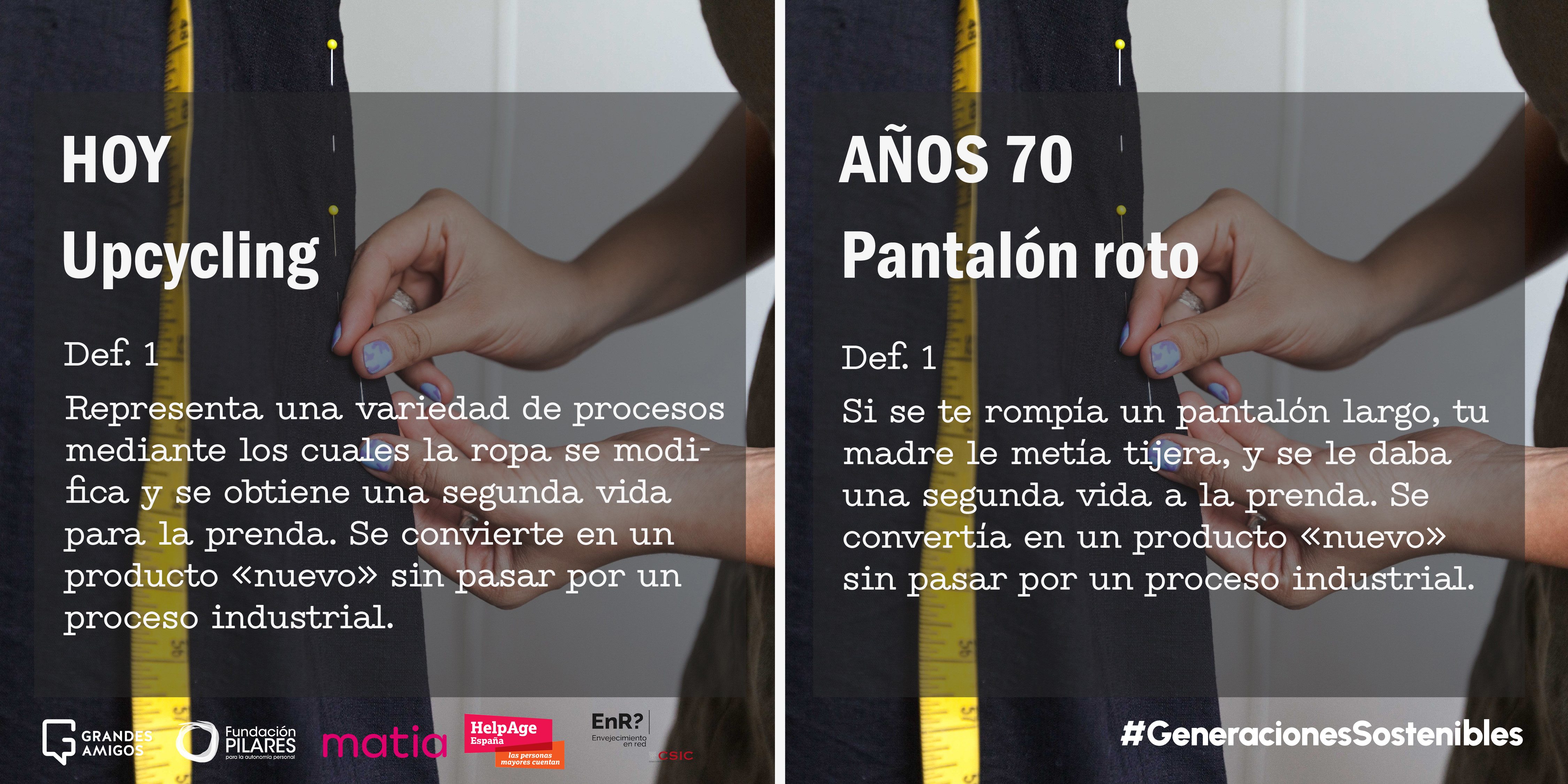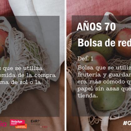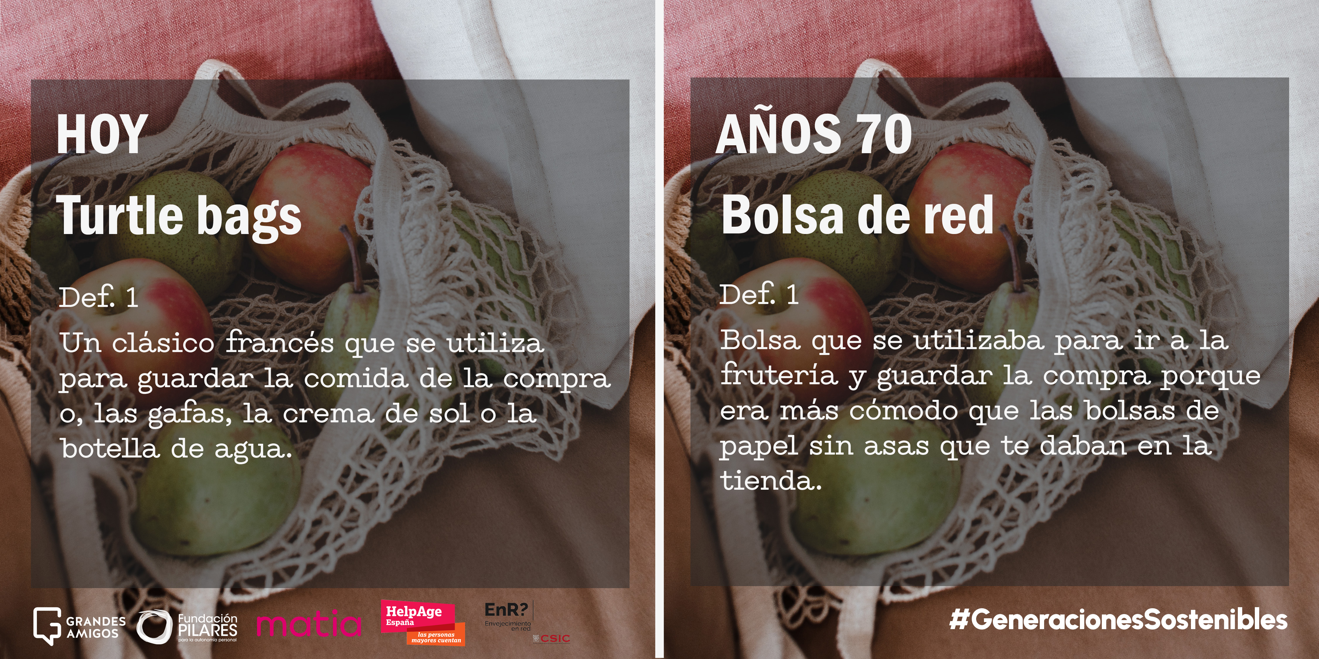 - La iniciativa ‘Soy mayor, soy como tú’, reivindica el reencuentro intergeneracional. Para ilustrar que jóvenes y mayores no están tan lejos, lanza en redes sociales (#LoQueNosUne #GeneracionesSostenibles) una serie de imágenes sobre conceptos o consejos sostenibles que ya se daban antes, aunque hoy se ‘vendan’ como nuevos, como: ‘upcycling’ vs remendar la ropa y reaprovecharla; ‘turtle bag’ vs bolsa de red.