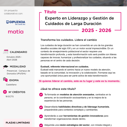 Donostia / San Sebastián, 4 de junio de 2025 – La Universidad del País Vasco (UPV/EHU), en colaboración con Matia y la Diputación Foral de Gipuzkoa, lanza el nuevo Título de Experto en Liderazgo y Gestión de Cuidados de Larga Duración, que comenzará en octubre de 2025 en el campus de Donostia. Esta iniciativa pionera busca formar a profesionales capaces de liderar el cambio en un sector clave para el bienestar social del siglo XXI.