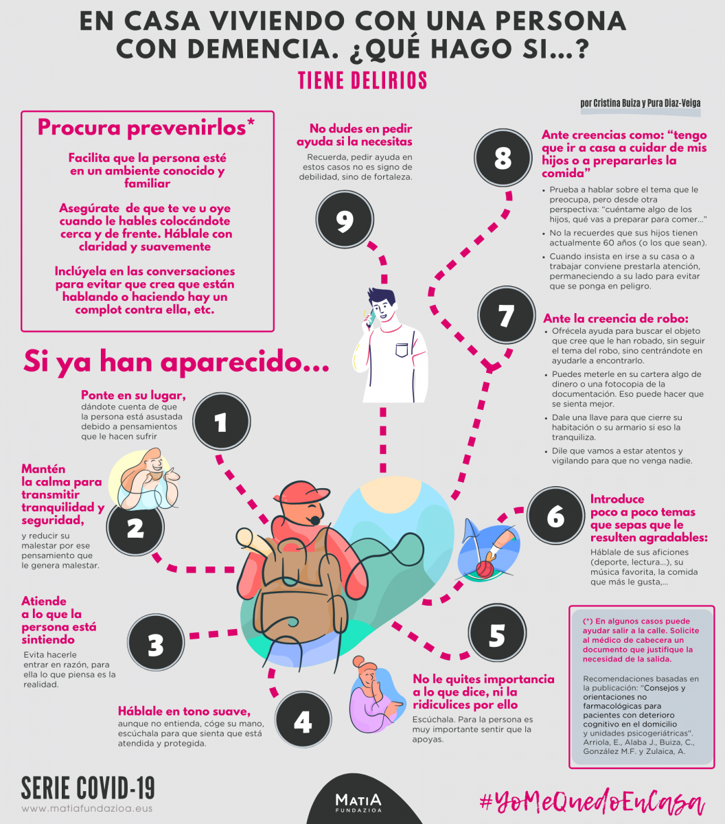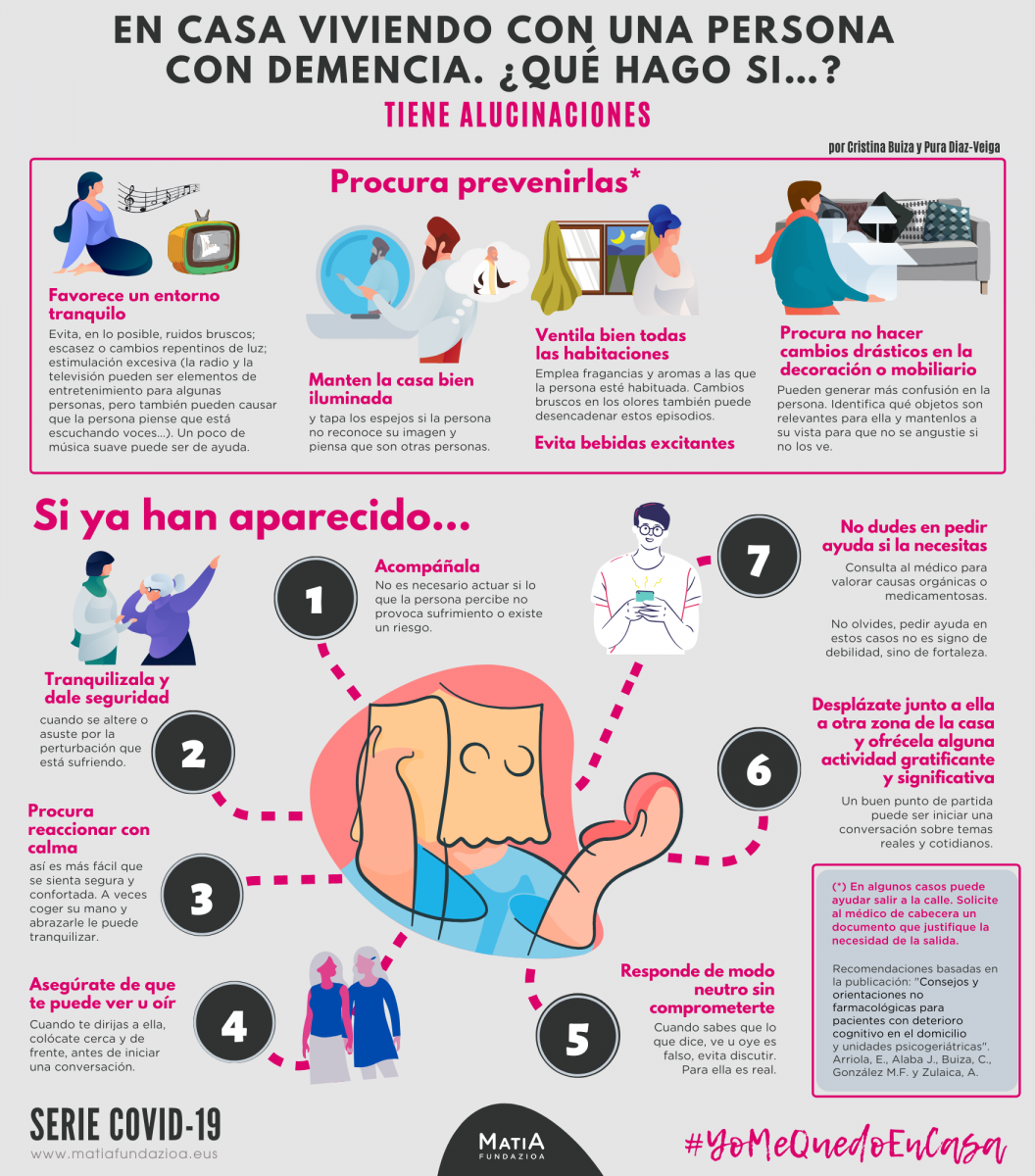 (*) En algunos casos puede ayudar salir a la calle. Solicite al médico de cabecera un documento que justifique la necesidad de la salida. Recomendaciones basadas en la publicación: "Consejos y orientaciones no farmacológicas para pacientes con deterioro cognitivo en el domicilio y unidades psicogeriátricas". Arriola, E., Alaba J., Buiza, C., González M.F. y Zulaica, A.