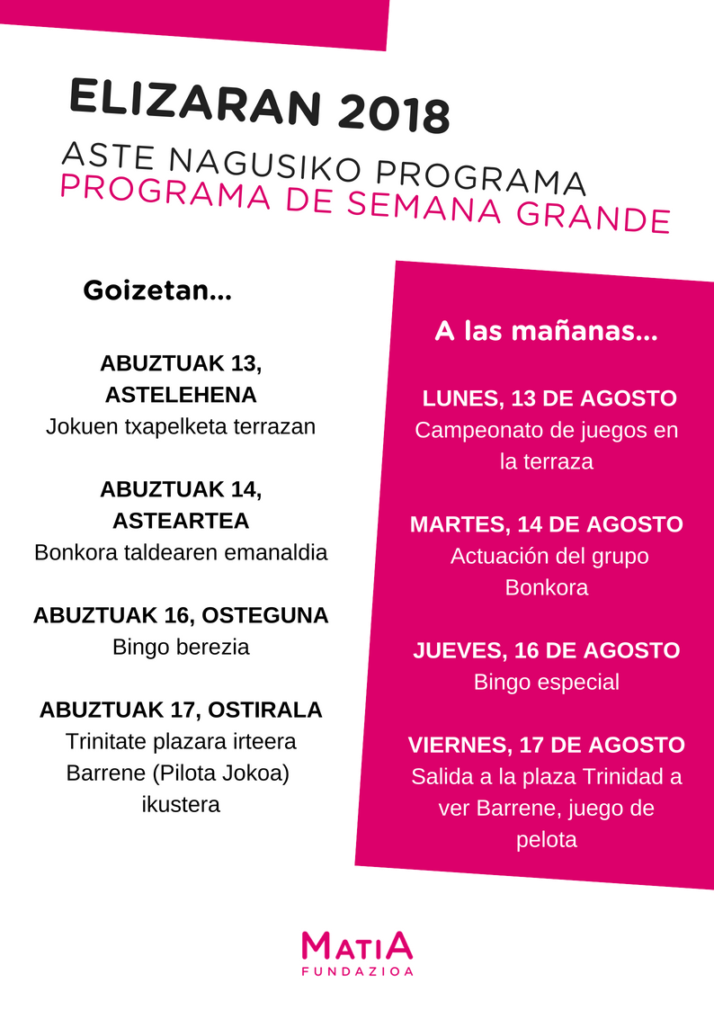 14.08.2018Programa de las actividades que se celebrarán durante fiestas de Donosti (Semana grande – Aste nagusia) en el centro de día Elizaran. Etiquetas: Elizaran