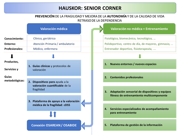 - Desarrollar estrategias y crear entornos y servicios amigables que faciliten la participación de los mayores en los programas de ejercicio funcional multicomponente como terapia óptima para revertir el estado de fragilidad y mejorar su autonomía y la calidad de vida. Para ello, el HAUSKOR creará el primer prototipo de centro piloto (Senior Corner), un ecosistema formado por dos ámbitos o escenarios: uno para la valoración objetiva y diagnóstico de la fragilidad en ámbito sanitario, y el otro para la valoración no médica en entornos comunitarios y entrenamiento de la capacidad funcional.
