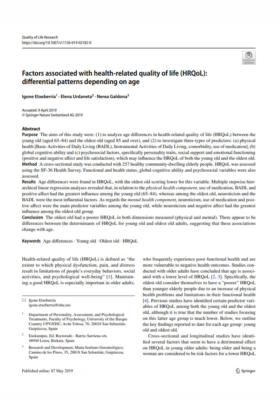 Los objetivos de este estudio publicado en la revista "Quality of Life Research" eran: (1) analizar las diferencias de edad en la calidad de vida relacionada con la salud (CVRS) entre adultos mayores de 65-84 años y personas mayores de 85 años y más, y (2) investigar tres tipos de factores predictivos para su: (a) salud física (actividades básicas de la vida diaria, actividades instrumentales de la vida diaria, comorbilidad, uso de medicamentos), (b) capacidad cognitiva global y (c) factores psicosociales, específicamente rasgos de personalidad, apoyo social y funcionamiento emocional (afecto y satisfacción con la vida), que puede influir en la CVRS de unos y otros.