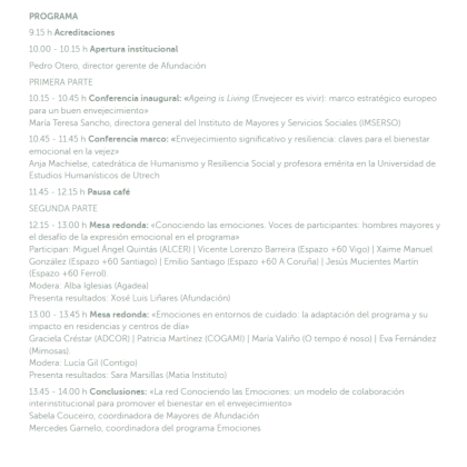 2026.03.13. Gero eta bizitza luzeagoa den testuinguru batean, egungo erronka ez da urte gehiago bizitzea, baizik eta ongizatearekin, helburuarekin eta zentzuarekin bizitzea. Ikuspegi horretatik abiatuta, Afundazioak «Emozioak ezagutuz» II. Jardunaldiak sustatuko ditu datorren astelehenean, martxoak 16, Vigoko egoitzan. Jardunaldi horiek zahartzeari buruzko hausnarketa positiboa egiteko foro bat dira, etapa honetako galera eta erronka bitalak alde batera utzi gabe, horiei aurre egiteko, horietara egokitzeko eta zentzuzko bizitza eraikitzen jarraitzeko behar diren indarguneei balioa emango diena. Topaketa 10:00etatik 14:00etara egingo da, eta arlo sozial eta sanitarioko, sektoreko erakundeetako eta publiko orokorreko profesionalei eta ikasleei zuzenduta dago.