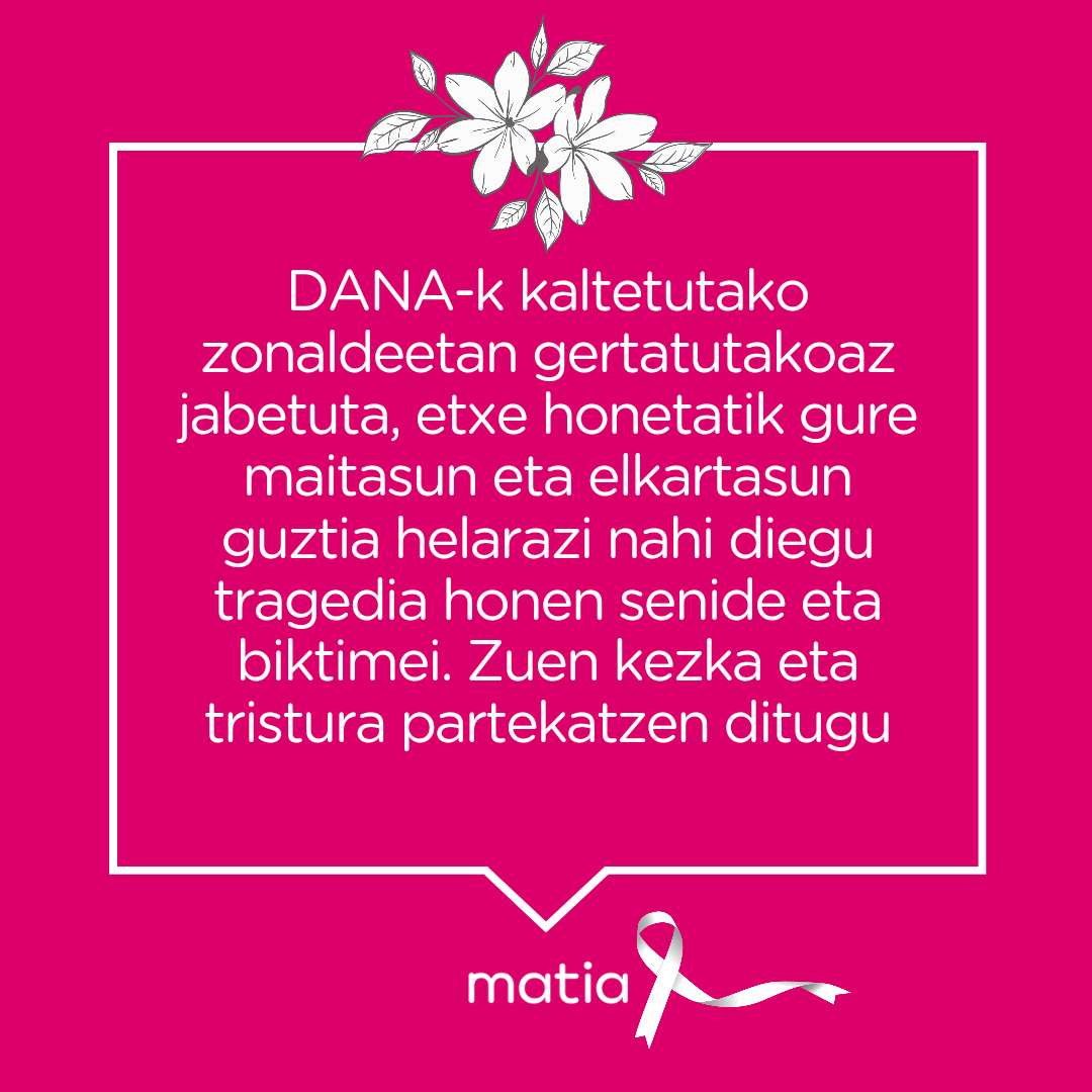 01.11.2024DANA-k kaltetutako zonaldeetan gertatutakoaz jabetuta, etxe honetatik gure maitasun eta elkartasun guztia helarazi nahi diegu tragedia honen senide eta biktimei. Zuen kezka eta tristura partekatzen ditugu