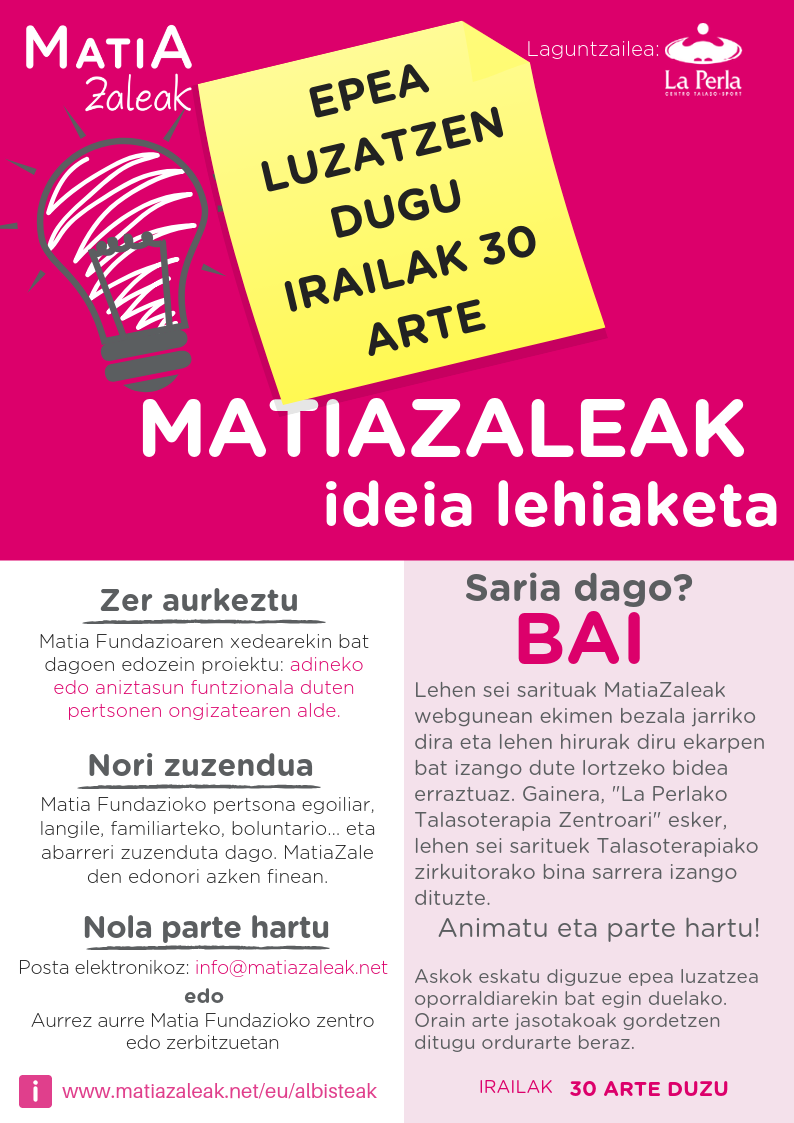 Animatu! Ziur ideia pila bat dituzuela! Idatzi eta posible izango da betetzea eta adinekoen eta ezgaitasuna duten pertsonen ongizatea hobetzea: info@matiazaleak.net
