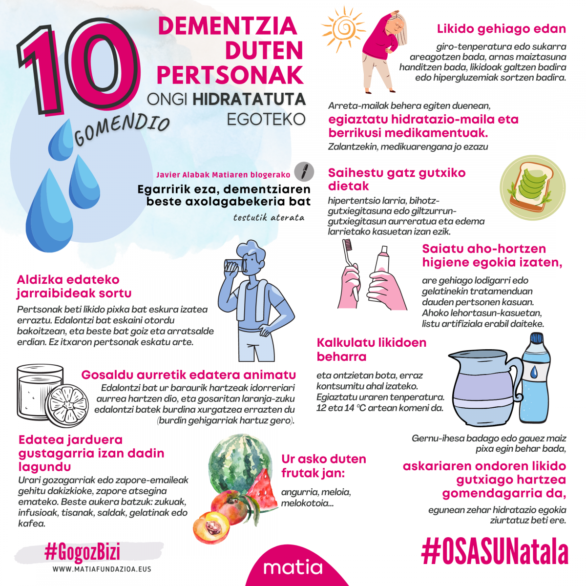 Zalantzarik gabe, garrantzitsua da pertsona horien osasuna eta ongizatea egoki hidratatzea. Edward Abbey idazle estatubatuarrak adierazi duenez: "Egarri handi bat poz handia da garaiz itzaltzen denean". Jarraian azalduko dizuegun dekalogoan, dementzia batekin bizi direnak ondo zaintzeko alderdi hori aliatu bihurtzeko gomendioak jasotzen dira.