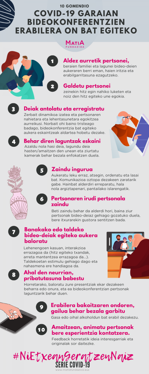 - Ahal den neurrian, pribatutasuna babestu. Horretarako, baloratu zure presentziak ekar dezakeen beharra edo onura, eta ea bideokonferentzian pertsonak laguntzarik behar duen.
