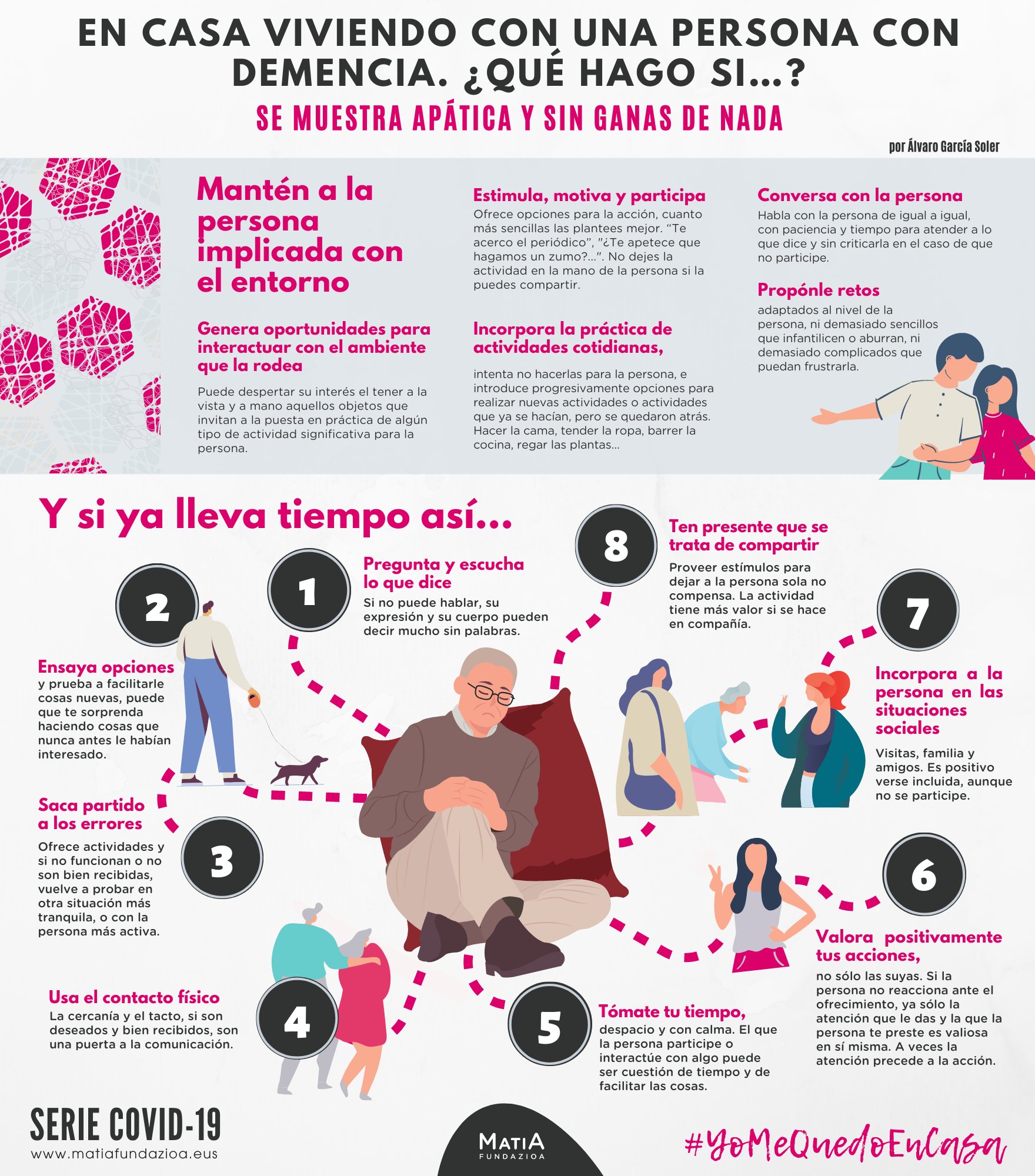 24.06.2020 - Infografia berria: etxean dementzia duen pertsona batekin bizitzen. Zer egingo dut? Apatiko eta ezertarako gogorik gabe agertzen da.