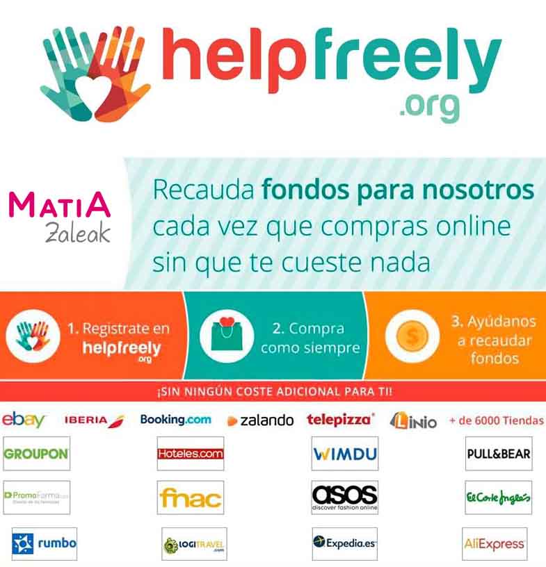 HelpFreely plataforma bat da, non klik bakarrarekin erregistratzen, online denda ezagunetan erosteko aukera duzun (Booking.com, Pull&Bear, El Corte Inglés, aliExpress, Promod, Nike, Wiggle, Telepizza España eta askoz gehiago... ia 5000 denda daude!!). Egindako erosketaren portzentai txiki bat zuzenean lagundu nahi duzun elkartera joango da, eta aukeren artean MatiaZaleak dago, eta ez du inolako kosturik zuretzat. Denda hauek HelpFreelyri esker solidarioak dira.